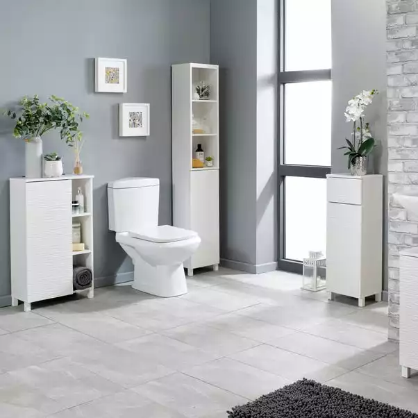 Featuring a modern, handle less design, this Tall Cabinet looks sleek and stylish, making it perfect for your bathroom space. It boasts 3 open shelves and two interior shelves, offering ample storage space for your home, meaning you can showcase your bathroom ornaments and plants whilst also internally storing all your toiletries neatly and discreetly.