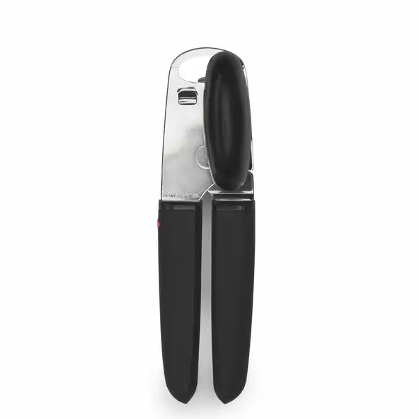 Finished in black, this OXO stainless steel can opener features cushioned handles and a built in bottle cap opener.